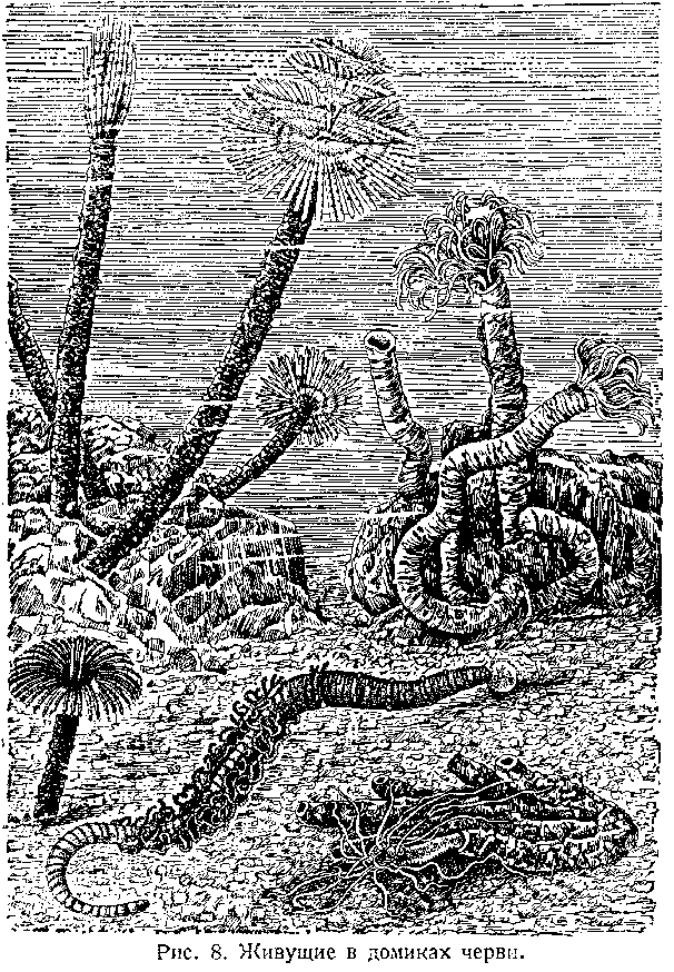На дне моря среди выступов окал ползают различные черви, похожие на мохнатых гусениц. По бокам этих червей много выростов, густо покрытых щетинками. Они ими пользуются при ползании и плавании. Некоторые черви живут в домиках. Одни черви живут в домиках, плотно прикреплённых ко дну. Другие — ползают по грунту, наполовину высунувшись из своих домиков, которые они таскают за собой. У этих червей развились различные выросты и щетинки около рта. Целые венчики окружают рот. Червь, вращая щетинками, создаёт ток — воды, с которым притекают частицы ила и мелкие организмы. Около рта создаётся водоворот, внутрь которого попадают пищевые частицы, заглатываемые потом червём. Так деятельно работают черви, сидящие в домиках. Свои домики они строят из обломков раковин, камешков, песка и цементируют всё это выделяемой слизью, которая затем затвердевает. Многие черви строят домик из выделяемой ими извести или из одной слизи, затвердевающей при соприкосновении с морской водой.