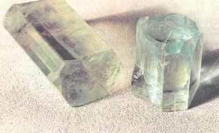 Близки к ним и своеобразные аквамарины знаменитых «изумрудных копей» на Урале. Но хотя их тоже называют там аквамаринами, облик их совсем особый. Цвет их можно определить как молочно-бирюзовый. «Стаканчики» этих бериллов невысоки — их длина лишь немного превышает диаметр, а обычный размер 3 — 5 см. Короткая призма завершена обычно с одной стороны плоской и блестящей шестигранной крышечкой. Нередко на ней можно разглядеть своеобразную «скульптуру»: над плоскостью грани (она называется пинакоидом) на 0,5 — 1 мм поднимается еще одна плоская шестигранная грань меньшего размера, иногда даже две или три. Приглядимся внимательнее: аналогичные ступеньки видны и на гранях призмы. Оказывается, что это не просто кристалл, а целый блок-кристалл: он сросся из отдельных призм, хотя на первый взгляд и выглядит как сплошной. Но самое интересное другое. В прозрачных кристаллах вдоль граней призмы в скользящем косом свете можно увидеть легкий серебристый «дождь», исчезающий при повороте. Более крупные «струйки дождя» ювелиры называют «грозди». Тонкие «струйки» могут создавать на гранях кристаллов, особенно на непрозрачных молочно-голубых гранях, узорный перламутровый отлив, подобный отливу муарового шелка. А у головки кристалла нередко видны своеобразные «снежные хлопья». Минералоги выяснили, что у аквамаринов, особенно у образовавшихся в грейзенах, их мельчайшие канальчики — соты — бывают заполнены пузырьками газа или жидкости. Под микроскопом они выглядят как шестигранные полые каналы, называют их отрицательными кристаллами — ведь у них те же грани, только оконтуривают они пустоту!
