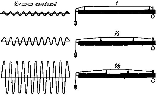 Если ударить струну посередине между подставками, то она будет совершать колебание, издавая звук определенного тона. Каждый тон, как известно, характеризуется определенным числом колебаний в секунду. Сблизив подставки, на которые опирается струна, так, чтобы расстояние между ними было вдвое меньше, можно обнаружить, что тон звучания заметно повысился. Струна, длина которой вдвое меньше, совершает в секунду вдвое больше колебаний. Если расстояние между подставками составляет одну треть от первоначального, то длина струны равна одной трети, и число колебаний в секунду при этом утроится. Тон звука еще более повысился. Продолжая уменьшать длину струны, обнаружим, что, во сколько раз уменьшается ее длина, во столько раз увеличивается число колебаний в одну секунду, если при этом ее натяжение остается неизменным, а звучание струны вызвано ударом по ее середине.