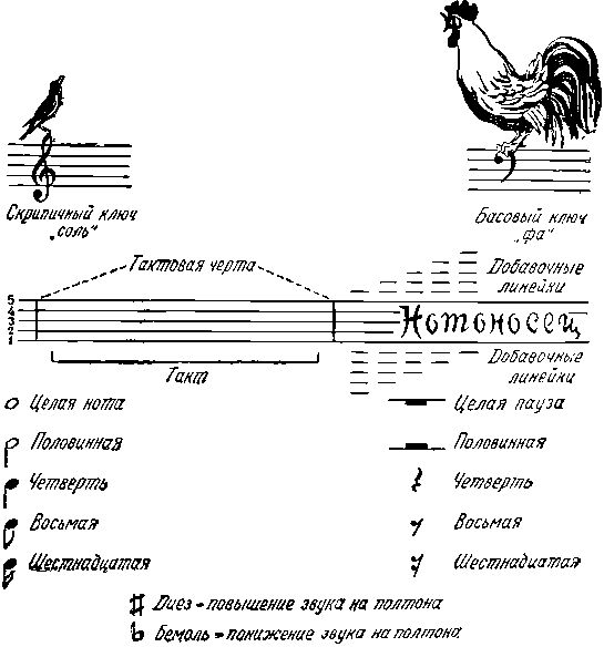 Кроме пяти основных линеек, существуют добавочные — пять вверху и пять внизу. Что означают значки на линейках, каким нотам они соответствуют, указывает ключ, который ставят в начале пяти линеек. Чаще всего встречаются два ключа: ключ «соль» — скрипичный и ключ «фа» — басовый. Основные линейки разбиты вертикальными линиями на части — так называемые такты. Они определяют длительность звучания. В начале пяти линеек мы видим ключ «соль», тогда внизу на первой добавочной линейке располагается значок, имеющий форму сплюснутого круга; это звук «до» третьей октавы, звучание которого должно длиться на протяжении одного такта.