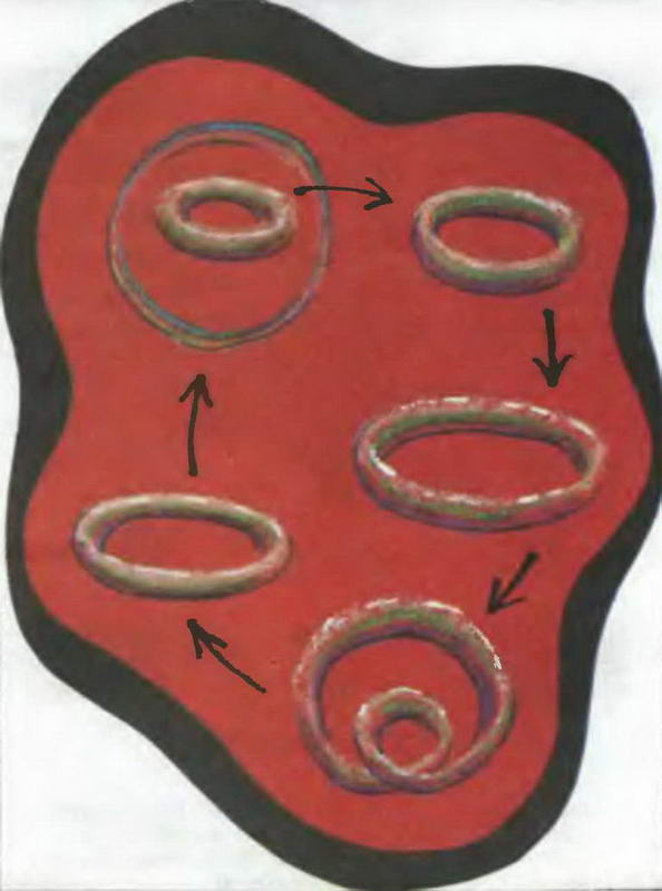 Предложенная А. Д. Сахаровым и Я. Б. Зельдовичем модель космического динамо - механизма, порождающего магнитное поле звезд, — математически сводится к преобразованиям, которые вы видите на рисунке, заимствованном из одной работы В. И. Арнольда: из сферы извлекается полноторие (бублик вместе с его внутренностью), растягивается вдвое, складывается в два витка и затем возвращается на свое место в сферу.