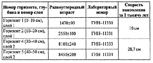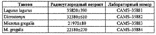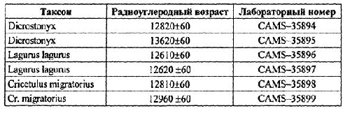 Таблица 2. Радиоуглеродные даты отдельных костных фрагментов из грота Шайтанский, придонный гор.22.