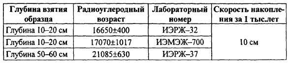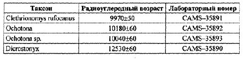 Таблица 4. Характеристики образцов и скорость накопления костных остатков грызунов из отложений пещеры Алексеевская (по: [Кузьмина, Смирнов и др. 2001]).