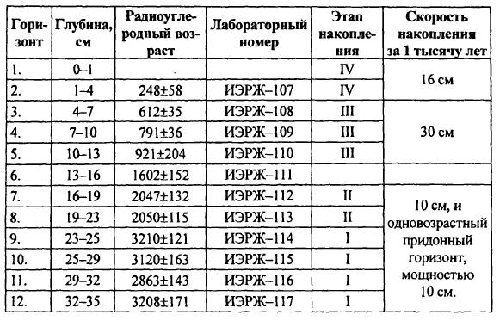 Во всех приведенных примерах условия осадконакопления были примерно одинаковы. Слои формировались на предвходовых площадках горизонтальных полостей за счет четырех процессов. Один из них — вынос продуктов химического разрушения известняка из внутренних частей полости (суглинок), другой — физическое разрушение стен и потолка с образованием щебня. Часто имело место накопление гумуса за счет отмирания растений, росших на светлой части площадки и, наконец — накопление остатков пищи хищных птиц в виде погадок, к которым иногда добавлялись кости крупных животных, принесенные в пещеру человеком или четвероногим хищником. Разумеется, общая скорость накопления отложений слагалась из скоростей каждого из этих процессов, и скорее приходится удивляться, что при такой непростой природе процесса наблюдаемые скорости различались не так уж сильно.