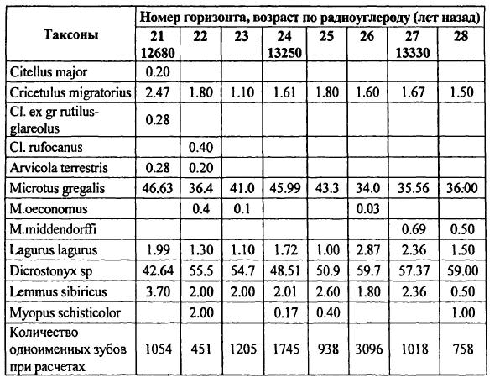 Таблица 7. Доли видов и число щечных зубов грызунов в условных горизонтах 21–28 слоя 10 грота Расик [Фадеева, Смирнов и др. 2000] (%)