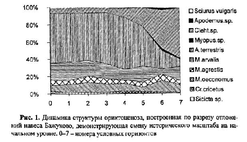 В качестве примера первого можно привести динамику состава фауны и структуры населения грызунов в позднем голоцене, прослеженные на материалах навеса Бажуково на Среднем Урале. Отложения в этом навесе вскрывались условными горизонтами по 5 см. На рис. 1 видно, что на изученном отрезке времени видовой состав остается постоянным. Наблюдается устойчивый тренд сокращения относительной численности полевок рода Clethrionomys и возрастание доли водяной полевки. Но поскольку общий южнотаежный зональный облик фауны сохраняется, а меняется лишь соотношение относительной численности зональных таежных видов и азональных обитателей лугов, то можно сделать вывод о том, что наблюдаемая динамика относится к начальному этапу исторических смен локальной фауны.
