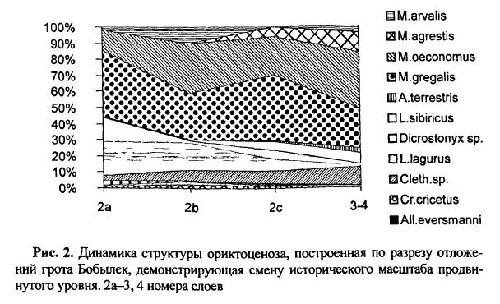 Другой пример демонстрирует продвинутый уровень исторической смены локальной фауны. На рис. 2 показана динамика состава фауны и структуры населения мелких млекопитающих, прослеженная по 5 слоям поздневалдайских отложений в гроте Бобылек [Смирнов 1993]. Верхний слой 2а имеет радиоуглеродный возраст 14 200 лет, а дата для слоя 3 — более 33 тыс. лет. На всем представленном отрезке разреза локальная фауна соответствует одному зональному типу. Это гиперборейная фауна, в которой копытные и сибирские лемминги соседствуют со степной пеструшкой и узкочерепной полевкой. Тем не менее, от слою к слою заметны сдвиги не только долей остатков видов разных групп, изменяется и видовой состав, в верхней части отложений ее характеристики ближе к типичной гиперборейной подзоне, а в нижних слоях нарастает доля лесных и луговых элементов, уменьшается роль степной пеструшки; узкочерепная полевка теряет доминирующее положение, исчезает ряд видов, типичных для аридных местообитаний, и наоборот, появляются мыши, белка и обыкновенный хомяк, которых не было в верхних слоях.