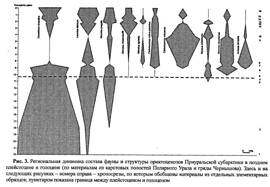 На рисунке 3 изображена динамика состава и структуры населения грызунов в позднем валдае и голоцене, реконструированная на основе исследования 16 элементарных образцов из карстовых полостей Полярного Урала и гряды Чернышова [Смирнов, Андреичева и др. 1999; Smirnov, Golovachev А 999; Головачев 1998; 1999; 2000]. Всего при построении этой диаграммы было изучено более 10 тысяч щечных зубов грызунов. На диаграмме видно, что для этого региона единственное эволюционное преобразование фауны произошло примерно через тысячу лет после плейстоцен-голоценового рубежа и было очень резким. Ему предшествовали смены внутри арктического комплекса, исторического масштаба, — от абсолютного доминирования копытного лемминга в позднем валдае, с нарастанием долей сибирского лемминга и узкочерепной полевки к позднеледниковью. Уже примерно 8 тысяч лет назад полностью сформировался субарктический комплекс, в котором видовое богатство выросло в три раза. Доминанты сменились до такой степени, что в середине голоцена таковым стала красносерая полевка при почти полном исчезновении леммингов из состава комплекса. Позднее, в течение последних 4 тысяч лет, снова стали расти доли зональных тундровых видов: леммингов, узкочерепной полевки и полевки Миддендорфа, но едва ли следует считать, что произошло второе преобразование эволюционного уровня. Хотя произошла новая смена доминантов, которыми снова стали упомянутые зональные тундровые виды, но лесные виды в качестве экстразональных в составе фауны сохранялись, и комплекс в целом на протяжении всего голоцена имел лесотундровый облик.