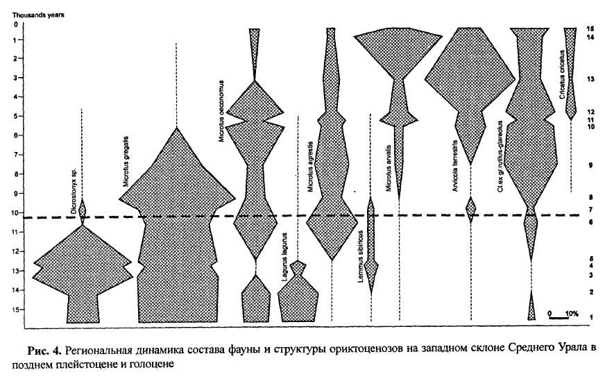 Всю прослеженную динамику можно разделить на два крупных этапа. Переход от одного к другому, как ни странно, проходит не по рубежу плейстоцена и голоцена, а приурочен к началу голоценового оптимума (около 7,5 тыс. лет). Именно здесь можно провести эволюционный рубеж в преобразовании регионального комплекса мелких млекопитающих. В течение всего первого этапа видом доминантом в ориктоценозах была узкочерепная полевка, уступившая на втором этапе роль доминанта лесным полевкам. Внутри первого этапа можно выделить три фазы развития, которым следует придать статус исторических смен. Эти фазы выделяются по смене субдоминантов. На первой фазе (16–14,5 тыс. лет) второе и третье место по относительной численности занимали копытный лемминг и степная пеструшка. На второй (14,5-11 тыс. лет) роль степной пеструшки в составе орикгоценоза резко сократилась, а копытный лемминг в середине этой фазы вышел на место содоминанта с узкочерепной полевкой. Далее его относительная численность резко сокращалась, и с плейстоцен-голоценового рубежа до середины голоценового оптимума его присутствие в составе ориктоценозов было едва уловимо. Третья фаза может быть обозначена как фаза деградации гиперборейного комплекса. Она продолжалась примерно до 7,5 тыс. лет. В ее начале узкочерепная полевка была сверхдоминантом (доля ее остатков превосходила 60 %), но затем, примерно за 2 тысячи лет она сократилась до 20 %. Степная пеструшка, как и ряд других видов из состава гиперборейного комплекса (сибирский лемминг, серый хомячок, степная пищуха) еще встречались, но, как и копытный лемминг, перешли в категорию редких видов.