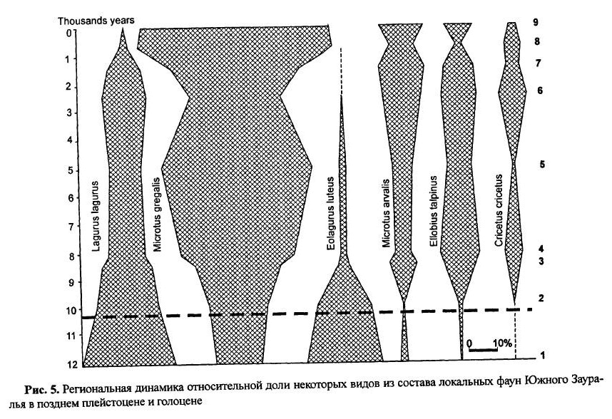 Фауны лесостепного, степного или полупустынного комплексов в позднем плейстоцене не имели в своем составе ни копытных, ни сибирских леммингов, а другие виды мелких млекопитающих — почти все общие с южным вариантом гиперборейного комплекса. Они известны в Предуралье, Зауралье и Западной Сибири [Зажигин 1980; Малеева, Стефановский 1988; Кузьмина, Смирнов и др. 2001; Кузьмина 2002]. В полевом сезоне 2002 года нами совместно с Е. А. Кузьминой и А. И. Улитко в Южном Зауралье, на междуречье рек Урал и Большой Кизил, были раскопаны отложения поздневалдайского и голоценового возраста в пещере Сыртинская с массовым остеологическим материалом и по крупным, и по мелким млекопитающим. На рисунке 5 приведены предварительные данные о динамике сообществ мелких млекопитающих Южного Зауралья в пределах современной степной зоны, полученные на базе обобщения сборов из 14 элементарных образцов, 4 местонахождений. Общее количество исследованных щечных зубов около 15 тыс. Первый хроносрез охарактеризован по материалам из условного горизонта 15 пещеры Сыртинская.