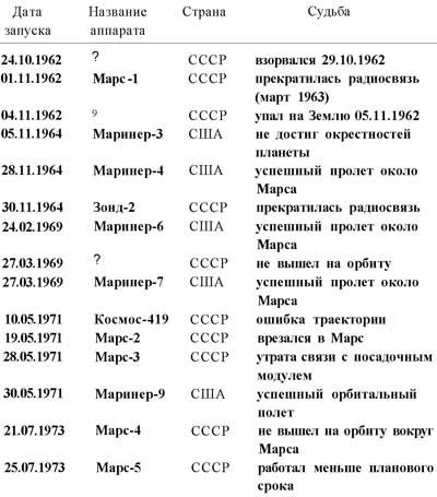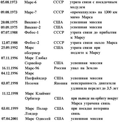 Это первая высадка на красную планету за последние 21 год. Техника за 2 десятилетия шагнула далеко вперед. Если наши «Луноходы» были тяжелыми машинами приблизительно по 800 кг, то американский марсоход при массе всего в 11,5 кг способен даже на большее. Увы, российский марсоход так и не смог достичь Марса, поэтому проект НАСА удачно назван «Первопроходцем». Стоит он «всего» 200 млн долларов, в то время как знаменитый проект «Викинг» обошелся американским налогоплательщикам в миллиард зеленых. Запуск «Пасфайндера» состоялся 4 декабря 1996 г. Пролетев 500 млн км за 7 месяцев, 4 июля 1997 г. он благополучно опустился на поверхность загадочной и мистически труднодоступной планеты (до сих пор на один удачный полет к Марсу приходилось по несколько взорвавшихся, упавших на Землю, утративших связь и неудачно севших станций — см. таблицу).