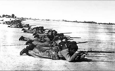 Стрелковая цепь на учениях ведет огонь из положения лежа, ок. 1900 г.