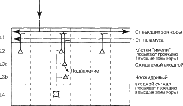 Клеткам слоя 5, имеющим проекции в таламусе, а затем в слое 1, тоже свойственна моторная функция, поскольку у них одновременно есть проекции в моторных зонах «старого» мозга. Таким образом, знание о том, что только что произошло (как в сенсорном, так и в моторном плане), присутствует в слое 1.