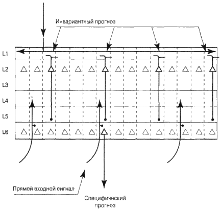 Рис. 6.11. Как зона коры головного мозга формирует специфические прогнозы, используя инвариантные репрезентации