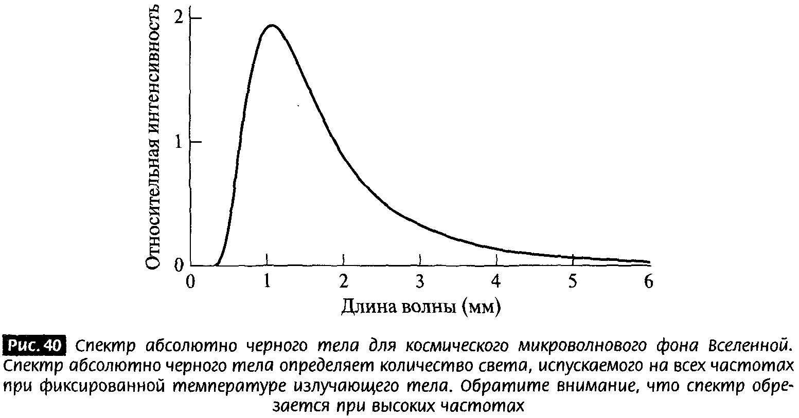 Недавно с помощью спутников был измерен спектр этого космического фонового микроволнового излучения (именно он показан на рис. 40). Он почти точно совпадает со спектром абсолютно черного тела температурой 2,7 К. Измерения показывают, что отклонения меньше одной десятитысячной. На самом деле такое реликтовое излучение является в наши дни наиболее точно измеренным спектром абсолютно черного тела.