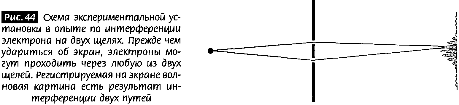 Корпускулярно-волновой дуализм обнаруживается в знаменитом эксперименте с двумя щелями, на который ссылается неизвестный собеседник Электры в начале этой главы. До 1961 года, когда немецкий физик Клаус Йонссон реально осуществил этот эксперимент в лаборатории, опыт с двумя щелями был скорее мысленным экспериментом, использовавшимся физиками для уяснения смысла и следствий поведения волновой функции электрона. Экспериментальная установка состоит из источника электронов, который посылает электроны сквозь барьер, в котором прорезаны две параллельные щели (рис. 44). Электроны проходят через щели, попадают на расположенный за барьером экран и регистрируются.