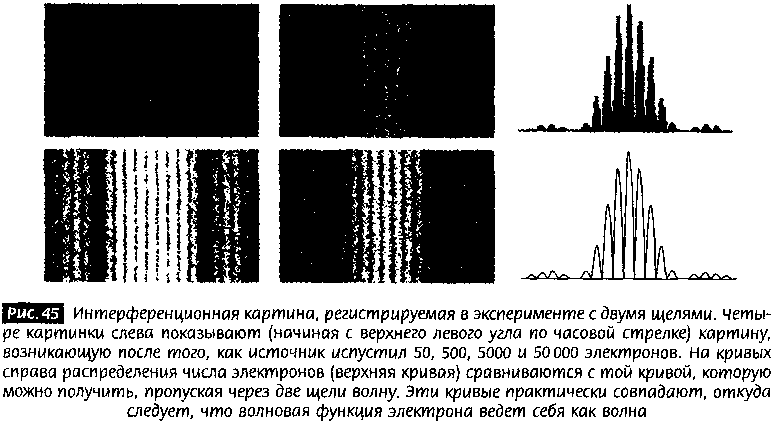 Действительно, если вы осуществите эксперимент с двумя щелями с электронами, вы увидите то же самое, что Юнг увидел для света — волновую картину на экране за щелями (рис. 45). В случае света мы понимаем, что волны интерферируют. Какая-то часть света проходит через одну щель, какая-то — через другую, и регистрируемая волновая картина отражает интерференцию между двумя волнами. Но что означает волновая картина для электронов?