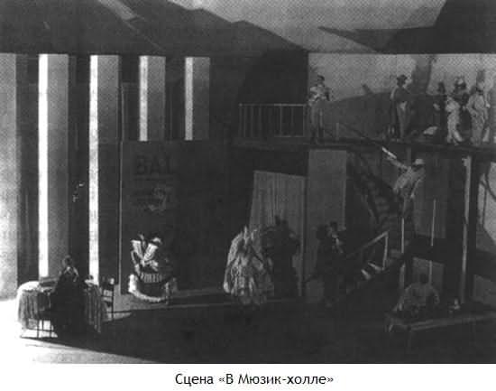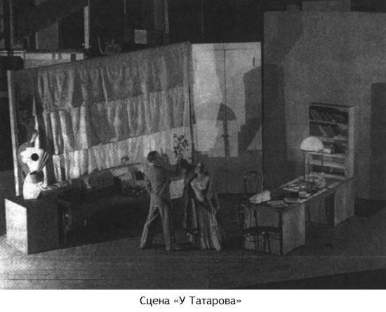 По контрасту с музыкально изощренным, многозвучным эпизодом «В Мюзик-холле» в сцене «У Татарова», судя по партитуре, музыка замолкала вовсе, сцена шла «сухо»: акцентировался диалог спорящих, Гончаровой и Татарова, освобожденный от какого бы то ни было фона, и поддерживающего, и контрапунктирующего.