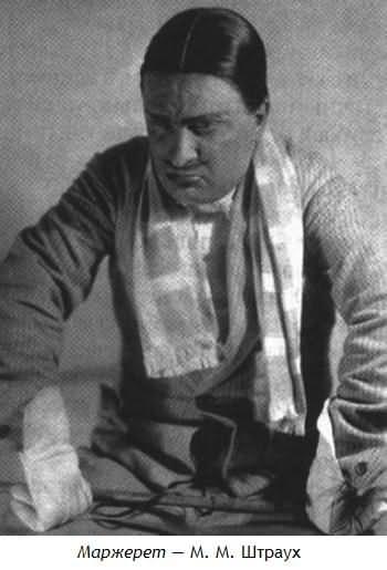 «Мейерхольд сделал ею укротителем зверей. В рыжих ботфортах со шпорами он носится по сцене и за отсутствием тигров рычит сам, избивая стеком свои ботфорты. Филигранную вязь диалога с многократным „почему“ он ведет, беспрестанно прыгая вокруг холщовой занавески, уготовленной для сего в глубине сцены»[535]. Критика заметила и особенность игры М. Штрауха: «Интересно играет Штраух. Однако его Маржерет <…> прежде всего исходит из изобразительных частностей, слагая из них чисто формальную структуру образа»[536]. Возможно, сущность того, что хотел Мейерхольд от Штрауха — Маржерета, точнее удалось понять Б. Алперсу, писавшему позднее, что: «В новых мейерхольдовских постановках создается органический сплав двух как будто разнородных стилевых пластов, еще недавно казавшихся несоединимыми. Прием гротеска, эксцентрического заострения игровых моментов не исчезает из палитры Мейерхольда, но теряет свою универсальность, перестает определять собой стиль актерского исполнения и всею спектакля в целом. Он начинает играть второстепенную, вспомогательную роль в руках режиссера…»[537]