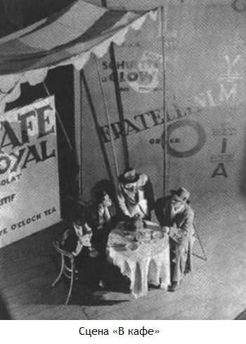 В сцене «В кафе» два прожектора освещали сцену белым ровным светом. Два фонаря (левой осветительной ложи) акцентировали внимание зрителя на поверхности стола, где появлялись газета со статьей о Гончаровой и револьвер.