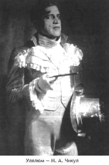 В структуре спектакля, кажется, вовсе не было незначащих, пустых эпизодов и фигур. Но все же еще одним из героев, определяющих поэтическую сущность пьесы и спектакля, оставался певец Улялюм — Лелино «эхо» в Париже, одинокий художник, чей дар растоптан и пущен на потребу толпы маржеретами. «Улялюм — это не просто пошляк, это граммофон, в котором /звучит/ великий Вертинский», — записывает на обсуждении пьесы М. М. Коренев[545]. (Улялюма на премьере играл М. Чикул, потом случались и принципиальные замены[546].) Как и в случае с Кизеветтером, критика требовала бесспорного осуждения героя, была недовольна тем, что «Улялюм дан в лирических, влекущих тонах»[547]. Что «сцена с Улялюмом разработана в дурной манере условно-символистского театра почти без малейшего иронизирования»[548]. Что «„великий“ Улялюм — олицетворенное убожество буржуазного искусства — режиссерски подан без тени иронии. Он выступает величаво, во всеоружии изящества и красоты, силы и превосходства»[549]. «Разве это Мейерхольд, который всегда в пьесах блестяще умел смеяться над обывателями, эстетами. <…> Разве Мейерхольд сумел здесь так внутренне посмеяться над Улялюмом? Он пошел за Улялюмом. <…> Эта песенка, она восхваляет Улялюма»[550]. Ю. Юзовский подводит итог «Единственный человек, оказавшийся родным Леле. Улялюм — это та же Леля»[551].