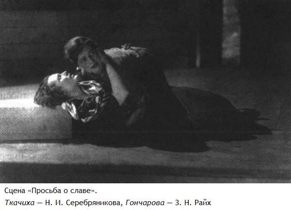 Игра актрисы оценивалась различно в зависимости от того, какую трактовку роли, сочувственную либо, напротив, иронически-презрительную, считал верной критик. Если одни полагали, что «Райх очень умно <…> проводит роль»[517], либо: «Чрезвычайно мягко, лирично, с большим тактом, ни разу не впадая в трагедию, ведет центральную роль Гончаровой Зинаида Райх»[518], то другие были уверены в том, что играть в таких тонах неверно. «Вряд ли можно согласиться <…> с трактовкой образа Гончаровой. Он значительно выиграл бы от иронии режиссера. Между тем этот образ принят Мейерхольдом всерьез. Это серьезное отношение превращает образ Елены Гончаровой в какую-то трагическую фигуру»[519].
