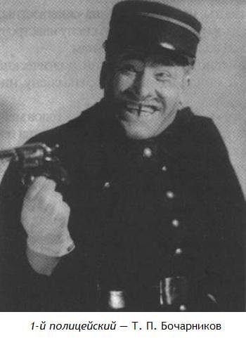 Режиссер вовлекал зрителя в действие, предельно сокращая дистанцию между сценой и публикой. На возможно более тесный контакт со зрителем работали и ступени, соединяющие сцену с партером, и такие приемы, как выход актера (актеров) из зала; вспыхивающий, общий сцене и залу свет; введение в вещную среду спектакля реальных, узнаваемых, сегодняшних предметов (например, свежей газеты) и деталей (так, не отмеченной рецензентами, но важной подробностью, сохранившейся на фотографиях спектакля, была крупно написанная на афише в эпизоде «В Мюзик-холле» фамилия «Grock», фамилия того самого знаменитого клоуна, в которого намеревался превратить Михаила Чехова немецкий импресарио[503]. Мейерхольд будто подавал знак далекому другу); мелодий (скажем, любимая российскими меломанами того времени песенка Мориса Шевалье[504], которую пел Улялюм). В финале в зрительский зал целились ружья драгун.