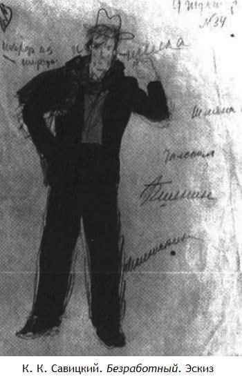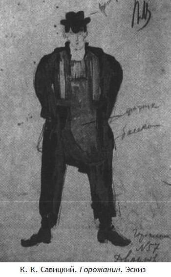Толпа безработных в финале была решена в грязно-серых, коричневатых, черных, асфальтовых тонах — темная, мрачная, угрюмая (эскизы большей части их костюмов и образцы тканей также сохранены в фондах ГЦТМ[583]).