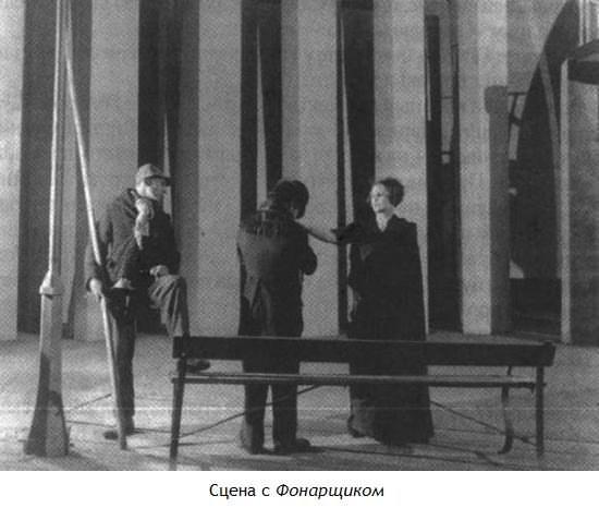 Сцена с Чаплином и Фонарщиком шла в таинственном «вечернем» освещении. Синий свет лился у колонны («две зеркалки с синим светом между колоннами», — помечал режиссер), синий прожектор и фонарь освещали Чаплина. Синим цветом мерцал и уличный фонарь. Гончарова появлялась у черной колонны в лучах зеленого прожектора (который гас, как только героиня отходила от колонны). С уходом Чаплина исчезал и синий свет.
