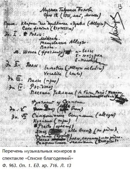18 июня 1931 года, спустя две недели после премьеры «Списка», Попов, не получив от Мейерхольда вестей, беспокоится: «Ждал от компании „друзей ‘Списка благодеяний’“ телеграмму в вечер кутежа. Но… или кутеж у Вас не состоялся, или „друзья ‘Списка’“ обо мне забыли. <…> Очень хотелось бы узнать, — продолжает композитор, — как использован тот марш-песня, который я написал в день отъезда, и как его исполняет Никольский?[598] Вероятно, исполняется лишь первая фраза этой песни. <…> Может быть, вообще марш не подошел, или в страшной спешке (предотъездной) я неудачно инструментовал? Вообще же этот марш надо исполнять очень строго ритмично. (Все аккорды должны браться строго одновременно, а не вразбивку, quasi arpeggiato, как это практиковалось в моем Rag-jazz’e.)» И, уже заканчивая письмо: «<…> с удовольствием вспоминаю тот накал, который ты давал мне в Москве во время работы над „Списком“»[599].