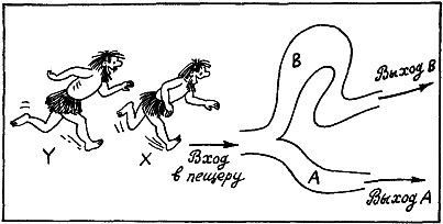На рис. 37 показана ситуация погони. Персонаж X пытается удрать от персонажа Y. Зная, что Y бегает быстрее его, X решает воспользоваться рефлексивным рассуждением, считая, что Y к нему не способен. Он вбегает в пещеру, показанную на рисунке, и при наличии двух коридоров А и В выбирает коридор В. Почему он это делает? Схема его рассуждений такова. Коридор А более приспособлен для передвижения, в нем можно бежать, а в узком коридоре В придется пробираться почти ползком. Другими словами, А