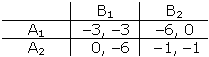 В этой матрице А1 и А2 обозначают два действия, которые может выбрать первый игрок, a B1 и B2 – действия второго игрока. На пересечении строк и столбцов написаны пары чисел, которые определяют выигрыши и проигрыши соответственно первого и второго игроков, когда они произведут одновременно свои альтернативные выборы.