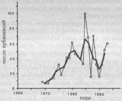 Рассуждения Дика о повышении статуса SETI проиллюстрированы любопытным графиком: «Рисунок… показывает рост литературы по межзвездной связи (исключая марсианскую традицию) с 1969 г.». График Дика показан на рис. 49 тонкой линией. Это ежегодное число публикаций. Но попробуем сгладить график по трем точкам (жирная линия) — и становится очевидным, что о «росте» там можно говорить лишь до середины 1980-х г. Затем наблюдается тенденция к снижению сглаженного уровня годового числа публикаций. Важно, что это снижение потока научной литературы произошло еще до прекращения финансирования SETI-проекта НАСА в 1993 году. Причем речь идет в основном о литературе благополучного Запада. Заметим, что для «нормальной науки» (терминология Дика) характерен экспоненциальный рост числа публикаций со временем. Мы же видим обратное — тревожный признак «кризиса жанра»?