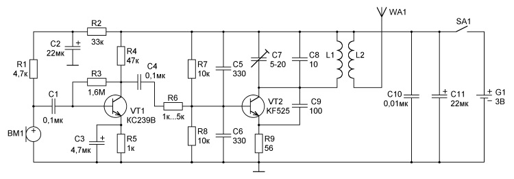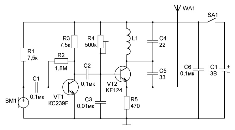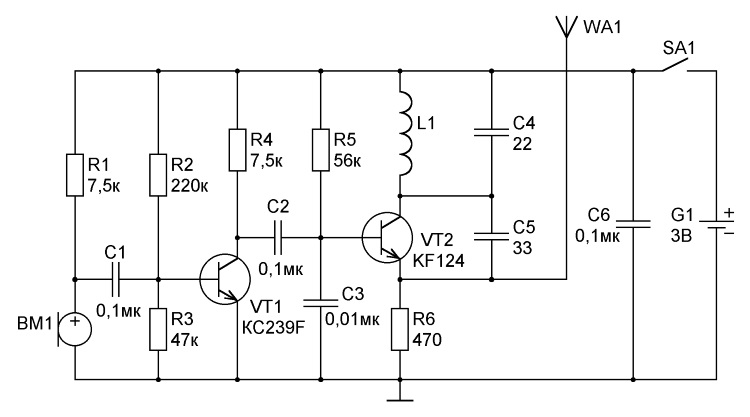 Рис. 5.6. Принципиальная схема простого радиомикрофона на двух биполярных транзисторах (вариант 1)