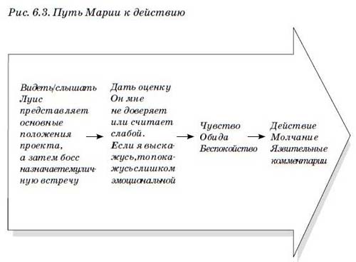 Естественно, как только мы даем соответствующую оценку, наш организм сразу же реагирует с помощью сильных чувств или эмоций, которые напрямую связаны с нашим пониманием добра и зла, хорошего и плохого, альтруизма и эгоизма, справедливости и несправедливости и т. д. Оценка ситуации Марией вызывает у нее только гнев и отчаяние. Эти чувства, в свою очередь, подталкивают к действиям: в результате она то замыкается в себе, то сыплет язвительными комментариями (рис. 6.3).