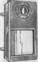 Внешний вид курсографа. Вверху в круглом отверстии виден диск со стрелкой в виде кораблика. Внизу в окне — движущаяся лента бумаги, на которой два пера записывают курс корабля. Правое перо отмечает градусы курса.