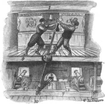 Управление рулем на корабле XVI века. 1 — верхняя палуба; 2 — ворот, свободно скользящий в шаровом шарнире, 3 — шар, служащий универсальным шарниром для ворота, 4 — руль; 5 — румпель; 6 — стопор; 7 — бимс, поддерживающий румпель; 8 — железный шкворень; 9 — железная палуба; 10 — батарейная палуба.