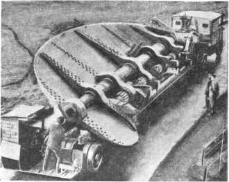 Руль английского океанского парохода «Беренджерия». Вес руля — 55 тонн. Для починки руль был снят с парохода и на специальной прицепной тележке, которую тащил мощный тягач, был отправлен из Саутгемптона в Дарлингтон. По железной дороге его нельзя было перевезти — не было подходящей платформы.