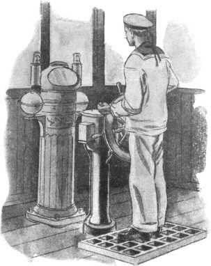 Гирорулевой работает только при ведении корабля по прямой линии — с постоянным курсом. При перемене курса, при вхождении в порт или выходе из порта за штурвал становится человек. Переход от автоматического управления к ручному и обратно совершается очень просто — к штурвалу присоединяется или разъединяется вспомогательный мотор внутри гирорулевого. Для этого служит тот большой рычаг, называемый соединительным, который мы видели на передней стороне тумбы гирорулевого.