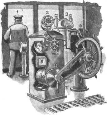 Автоматический рулевой. 1 — рулевой; 2 — компас-репитер; 3 — магнитный компас; 4 — телемотор; 5 — регулировка телемотора; 6 — регулировка курса в зависимости от погоды; 7 — регулятор; 8 — штурвальчик, управляющий рулем корабля так же, как и большой штурвал 14; 9 — реле; 10 — исполнительный электромотор, соединенный со штурвалом 14 с помощью цепи; 11 — шкив мотора; 12 — кожух для цепи; 13 — рычаг для выключения электромоторов, а с ним и всего гирорулевого.