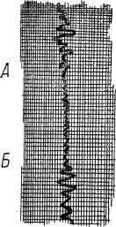 Запись курсографа (рассматривается сверху вниз). До А было ручное управление — пароход сильно рыскал. В А управление передано гирорулевому — рыскание уменьшилось. В Б гирорулевой выключен. Снова ручное управление — корабль опять сильно рыскает.