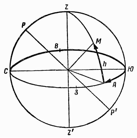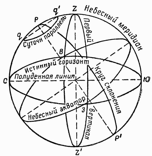 Прямая линия, проходящая по оси вращения Земли (или параллельно ей), называется осью мира, а точки ее пересечения с небесной сферой— полюсами мира: Р — северный, Р' — южный.