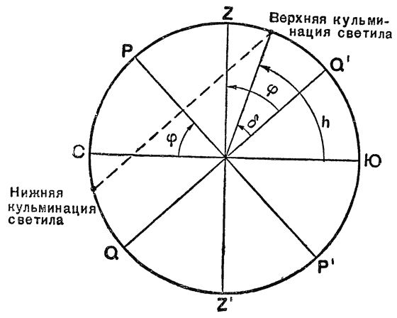 Весьма важным является соотношение между широтой места наблюдателя φ, склонением δ и высотой h светила в момент его кульминации. На рис. 12 показано светило в верхней кульминации между точкой юга и зенитом. Из рисунка видно, что в этом случае