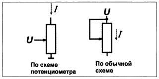 Поскольку вывода три, то переменный резистор может подключаться двумя способами: как простой резистор (тогда вывод движка объединяется с одним из крайних выводов), и по схеме потенциометра, когда все три вывода задействованы. Оба способа подключения показаны на рис. 5.2. Резисторы по своему предназначению служат для преобразования напряжения в ток и обратно — в соответствии с этим схема обычного включения переменного резистора служит для преобразования напряжения U в ток I, а схема потенциометра (делителя напряжения) — тока I в напряжение U. Кажется, что в схеме обычного включения необязательно соединять вывод движка с одним из крайних выводов — если оставить незадействованный крайний вывод «висящим в воздухе», то ничего в принципе не изменится. Но это не совсем так — на «висящем» выводе возникают наводки от «гуляющего» в пространстве электрического поля, и правильно подключать переменный резистор следует именно так, как показано на рис. 5.2.