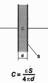Рис. 5.5. Схематическое изображение плоского конденсатора и формула для расчета его емкости: С — емкость, Ф; S — площадь пластин, м2; d — расстояние между пластинами, м; s — диэлектрическая проницаемость