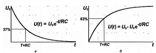 При обычной фиксированной нагрузке с сопротивлением R так, конечно, не происходит — напряжение на конденсаторе падает по мере истощения заряда, значит, ток через нагрузку также пропорционально снижается — в полном соответствии с законом Ома (помните, мы говорили, что простой резистор есть плохой источник тока?). Опять приходится брать интегралы, потому мы приведем только конечный результат: формула для расчета процесса снижения напряжения на емкости при разряде ее через резистор и соответствующий график показаны на рис. 5.7, а. А на рис. 5.7, б показан аналогичный процесс, который происходит при заряде емкости через резистор.