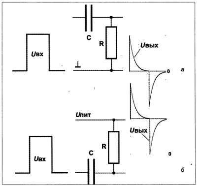 Если подать на вход цепи, состоящей из резистора R и конденсатора С, прямоугольный импульс напряжения, то результат будет различным в зависимости от включения R и С. Переходные процессы в таких цепях подчиняются основным закономерностям, представленным на рис. 5.7, но имеют и свою специфику. На рис. 5.9 показаны два способа включения RC-цепочки в схему с прямоугольными импульсами на входе (здесь они не такие, как на рис. 4.6, б, а однополярные, т. е. напряжение меняется по величине, но от потенциала «земли» до напряжения источника питания).