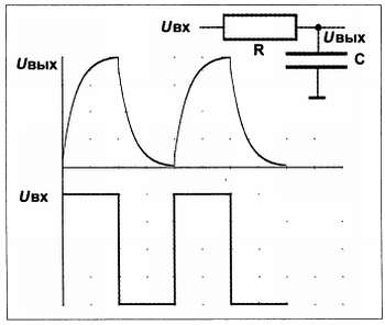 Такое включение называется дифференцирующей цепочкой или фильтром высоких частот — потому что оно пропускает высокочастотные составляющие, полностью отрезая постоянный ток. Чем больше постоянная времени RC в этой схеме, тем ниже частота, которая может быть пропущена без изменений, — в пределе импульсы высокой частоты пройдут почти неизмененными. Наоборот, если постоянную времени уменьшать, то пики на графике будут все больше утончаться. Этим эффектом широко пользуются для выделения фронтов и спадов прямоугольных импульсов (см. главу 16).