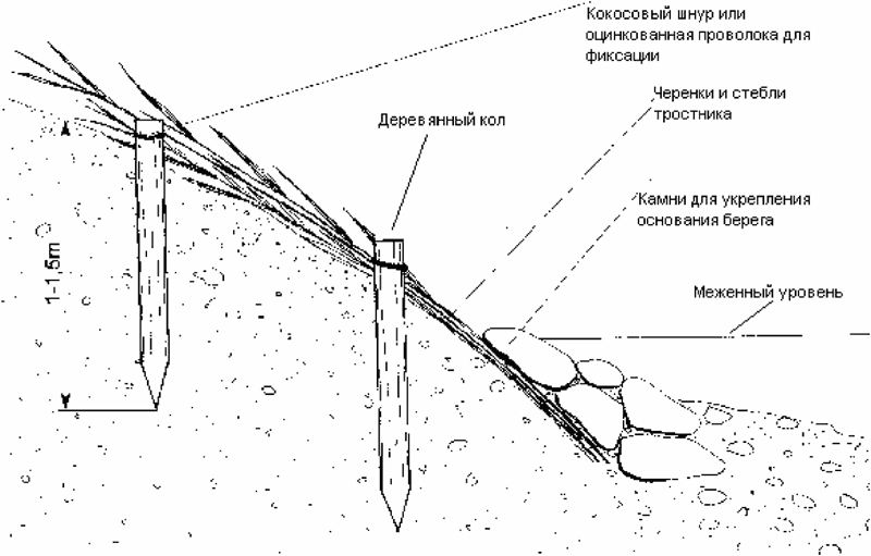5. Заборы, дамбы, буны, преграды из бревен и ветвей. Они применяются для локального изменения силы водного потока и используются, в основном, в проточных водоёмах шириной свыше 10 м. По применяемым материалам различают конструкции каменные, из свежесрубленных деревьев, из фашин, из ветвей, кольев и т. д. Для укрепления берегов наиболее эффективны буны, расположенные против течения под углом 75–80°. Буны не целесообразно располагать на расстоянии друг от друга, более чем в 1,5–2,5 раза превышающем их длину. В противном случае течение может разрушить берег. Между бунами откладываются наносы и образуются участки со слабым течением. Эти межбунные пространства имеют большое экологическое значение, являясь естественным местом обитания растений и размножения водной фауны.