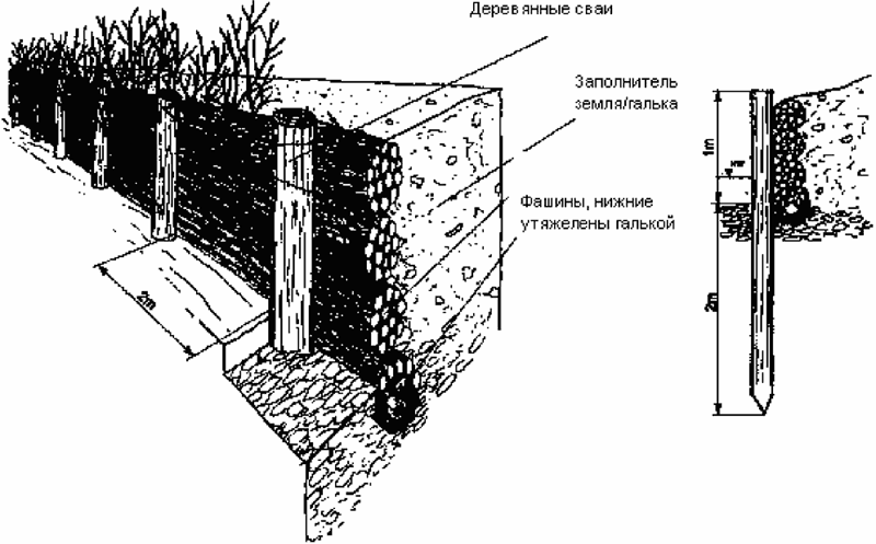 4. Сооружения из пней. Живые или сухие пни древесных растений плотно устанавливают друг к другу на склоне или у берега и привязывают к ранее вбитым деревянным сваям при помощи стального троса. Пустоты между корнями засыпают камнями или речным материалом. Это сооружение имеет ограниченную сферу действия и в основном предназначено для укрепления низких берегов. Оно также может применяться в качестве основы для формирования островков в местах, где нет больших гидравлических нагрузок и допустимы небольшие повреждения. Пни с корнями могут также хорошо укреплять склон. При этом они не должны возвышаться над поверхностью более чем на 20 см.